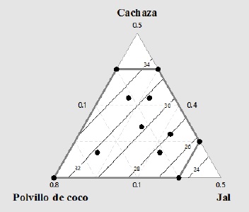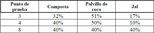 Palabras clave: Mezcla, sustrato orgánico, jal, cachaza, composta, polvillo de coco, diseño simplex.