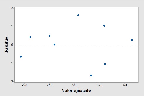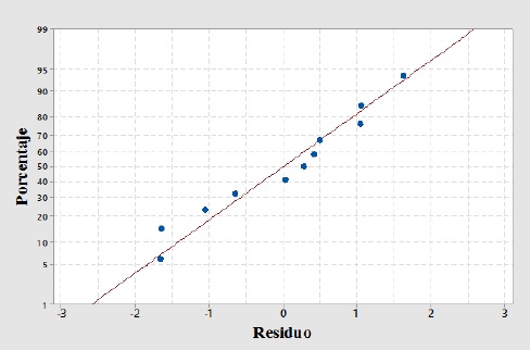 Análisis de residuos. En la figura 5 se muestra la gráfica de residuos del modelo ajustado, donde se observa que estos varían aleatoriamente alrededor de la línea central contra los valores predichos, la figura 6 muestra la gráfica de residuos contra los cuantiles de una distribución normal; aquí se observa que el error experimental sigue una distribución normal todo lo anterior indica un buen ajuste del modelo.}