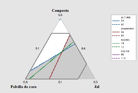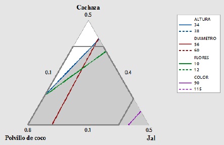 Mezcla óptima. Este mismo análisis fue realizado para el resto de las características o variables de respuesta (diámetro de la planta, número de flores y color de la planta), para la mezcla cachaza-polvillo de coco-jal; en todos los casos el modelo lineal obtenido para cada variable durante el periodo de tiempo determinado resultó adecuado y el análisis de residuos demostró el buen ajuste del modelo; la figura 7 muestra las superficies de contornos superpuestas de las cuatro variables, en la que se optimiza la mezcla para la cachaza, donde se observa que en el área de respuesta máxima ocurre en el punto 4, en el cual la mezcla óptima es: