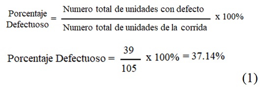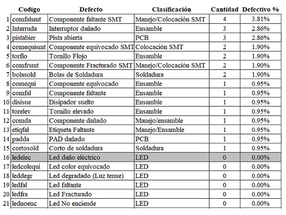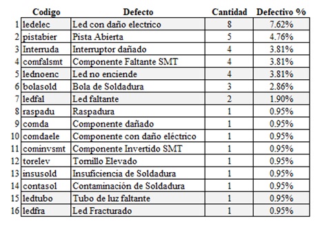 Durante el experimento se utilizan hojas de verificación para registrar la presencia o ausencia de características particulares de las tarjetas electrónicas, basándose en los criterios de aceptabilidad o rechazo para los ensambles electrónicos contenidos en el Standard IPC-A-610E [7] usado en la industria electrónica. Los datos se recopilan manualmente por los inspectores de calidad utilizando un listado de códigos de defecto que sirven para identificar los 53 tipos de defectos definidos para el experimento, así como Inspecciones, Operadores, Inspectores y Turnos operativos involucrados en el proceso de las unidades. Al término del vaciado de los datos en una hoja de registro se procedió a elaborar la tabla 2 con las cantidades de defectos encontrados en cada una de las categorías de los defectos que se definieron para el experimento, registrándose 16 defectos del listado de códigos de defectos. Se calculó el respectivo porcentaje de contribución de cada defecto y en la operación donde se generó, dando como resultado un total de 39 defectos de 105 unidades inspeccionadas equivalente a un nivel de rechazo del 37.14% (1).