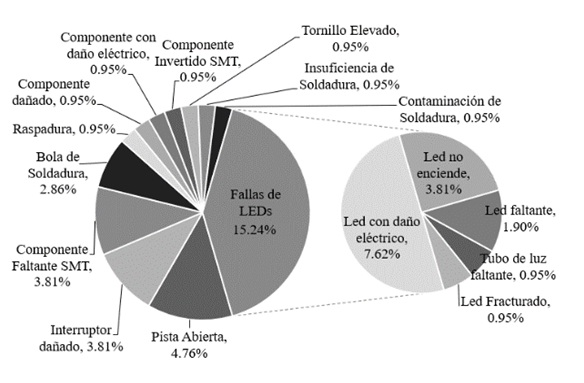 Como se mencionó, los defectos de LED o Diodo Emisor de Luz en la tarjeta representan la mayor contribución de defectivo generado durante la producción de la unidad, por esta razón la mejora de la manufactura se dirige hacia los defectos de LED y como consecuencia se espera que las fallas en el campo disminuyan y los inventarios de reparación se vean beneficiados, así como los tiempos de ciclo de análisis de falla también sean menores. La importancia de los LED en las tarjetas electrónicas y su interacción con los operadores finales de los equipos representa una interfaz necesaria, que representa en la tarjeta varias entradas recibidas y las salidas transmitidas a circuitos electrónicos donde cada una de las salidas representa un comando de control basado en hardware que facilita la visualización en campo del estatus de la unidad [10]. Se han identificado varios tipos de mecanismos de falla de componentes electrónicos que alteran la integridad mecánica y eléctrica del componente, en este caso el de los LED no es la excepción. Algunos de ellos son intrínsecos debido a la arquitectura de los componentes donde la naturaleza de la encapsulación también juega un papel importante, pero el vínculo débil en la electrónica sigue siendo las conexiones que originan la mayoría de los defectos. Del mismo modo los mecanismos de falla extrínsecos resultan de sobretensiones, sobrecalentamiento, golpes mecánicos que tienen un efecto más perjudicial en la interconexión que en el componente mismo. Algunos mecanismos dependen de los procesos de fabricación, defectos de centrado y presencia de polvo, pero uno de los mecanismos que afectan los enlaces adhesivos en la electrónica provienen principalmente de la encapsulación o el encapsulado plástico, así como la permeabilidad a la humedad.