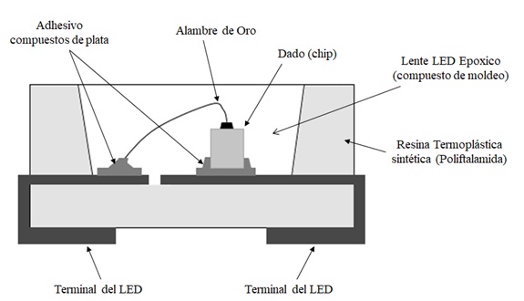 La investigación del LED se realizó mediante un estudio de inspección y/o análisis en el microscopio electrónico de barrido SEM preparando la muestra de LED con un corte seccional transversal orientado hacia el dado del LED, previamente encapsulado con un epoxi sometido a un pulido fino en el borde del componente, esto con la finalidad de revelar cualquier plano vertical interno del LED. Al someter el LED a la inspección microscopía en dos muestras de LED, una con falla y otra sin falla, se encuentra que el LED con falla presenta delaminaciones visibles del adhesivo de plata en las uniones del dado con las terminales del LED [12], pero no así en la muestra del LED bueno que no presenta alteración alguna en el adhesivo. La delaminación del adhesivo identificada se asocia con una degradación del adhesivo, el cual puede deberse a la permeabilidad del encapsulado del LED que mantiene con los gases y vapores del medio ambiente. Esto puede suceder puesto que al condensarse los vapores, se forma humedad que puede acumularse dentro del encapsulado y explotar al incrementarse la temperatura de soldado del componente en el horno de reflujo, durante el proceso de manufactura de la tarjeta electrónica. Este daño del LED se observa con mayor frecuencia como una delaminación en la interfaz del adhesivo de unión que se sitúa entre la base del dado semiconductor y la terminal y en muchos casos también en los sustratos con la formación de protuberancias, grietas y huecos en dichas interfaces del adhesivo causando estos daños estructurales y un desprendimiento del dado con las terminales que resultan finalmente en un circuito eléctrico abierto para el LED.