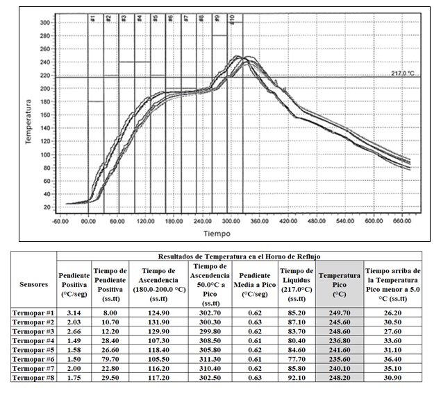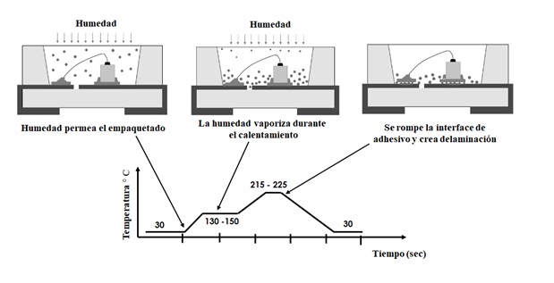 Donde PH2O es la presión del vapor de agua y K es una constante de proporcionalidad. Para conocer el nivel de exposición a la humedad permisible del LED y evitar daños durante el reflujo de soldadura en la tarjeta se identificó su nivel de sensibilidad a la humedad (MSL), el cual se define como nivel MSL 3. El estándar de la industria electrónica IPC/JEDEC J-STD-033B.1 señala que si un componente electrónico nivel 3 de sensibilidad a la humedad estuvo expuesto más de 168 horas al medio ambiente a 30°C / 60% HR fuera, su empaque deberá se horneado para extraer la humedad antes de ser procesados en el reflujo [11].