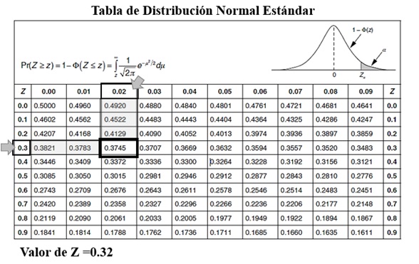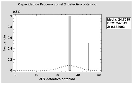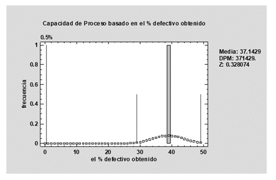 Se convierte el porcentaje de unidades no conformes en una fracción no conforme que para esta corrida el porcentaje de unidades no conformes es igual 37.14%, por lo que al convertir a una fracción quedaría igual a 0.3714. Se encuentra el valor Z en las tablas de distribución normal estándar [9] correspondiente a la fracción de unidades no conformes o con falla, donde la fracción no conforme representa el área bajo la cola derecha de una distribución normal. En caso de no localizar el valor exacto en la tabla tomaremos el valor inmediato superior que es igual 0.3745. Finalmente, el valor Z representa el valor sigma del proceso (Tabla 4) [9]. Es decir, el valor Z de proceso convierte el porcentaje promedio de defectuosos en un índice de capacidad similar a los calculados cuando se evalúa la capacidad de datos continuos. En la mayoría de los casos es deseable un valor Z de al menos 4, sin embargo para este caso el valor de tablas es Z= 0.32 muy por debajo de 4.