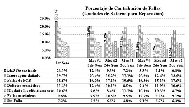 Mediante la metodología Seis Sigma se logró mejorar la confiabilidad del producto identificando el defecto principal con alta tasa de fallas en campo, logrando una disminución del inventario de unidades defectuosas retornadas a la planta, dando como resultado final la disminución del tiempo de ciclo empleado en las diferentes operaciones del diagnóstico y reparación de las unidades. Los pasos de esta metodología; definir, medir, analizar, mejorar y controlar, se visualizaron embebidos dentro de un modelo de lazo cerrado y continuo que condujeron al proyecto al análisis matemático y estadístico, así como a la investigación de procesos y la aplicación de ciencia de materiales como fue el caso de la falla de LED, que debido a factores externos de humedad y temperatura generaban una fractura mecánica en el material higroscópico encapsulado, durante las altas temperaturas del montaje. También, a través de la formación de equipos multifuncionales, se logró explorar, identificar y mostrar las posibles causas relacionadas con los problemas que generaron que las unidades fallaran en el campo; así como la condición para descubrir sus causas raíz que posteriormente fueron validadas y analizadas mediante el diseño de experimentos. La aportación de la investigación reside en haber generado mediante una metodología de calidad la experiencia y la base del conocimiento para el desarrollo y optimización de los procesos establecidos en la fábrica, procurando que esta experiencia adquirida por el equipo multifuncional sea reproducible para futuras investigaciones de los problemas que afectan la calidad de las tarjetas electrónicas que se producen en la planta, dando el enfoque para crear mejores prácticas de manufactura en los procesos de producción que están fuera de control y migrando a la vez a nuevas condiciones de operación basadas en la generación de acciones de mejora y corrección de los métodos de ensamble. Los análisis de laboratorio efectuados a nivel estructura del componente levantaron una alerta interna para poner en el radar los componentes similares que podrían ser afectados por las malas prácticas de manufactura y considerarlos como críticos en los planes de control del proceso.