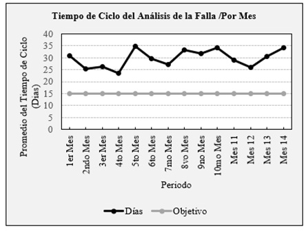 El tiempo de ciclo que tarda el análisis de las fallas en la línea de reparación es cercano a los 30 días lo cual está muy por arriba del objetivo fijado por la fábrica que es de un máximo de 15 días calendario (ver Figura 1).