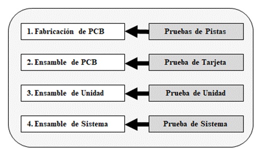 Una tarjeta electrónica generalmente consiste en una o más unidades compuestas de circuitos impreso con una integración de componentes electrónicos a gran escala. Los pasos requeridos para fabricar un sistema electrónico se ilustran en la Figura 2 y son susceptibles a defectos de fabricación; por lo tanto, se requieren pruebas en estas etapas para verificar que el producto final está libre de fallas eléctricas funcionales.