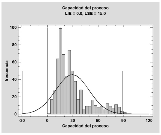 Capacidad del Proceso: Durante la fase de Medir se le dio como enfoque principal al comportamiento de los tiempos de análisis de fallas registrados en un año, obteniendo un tiempo empleado en promedio de 29.53 días. Del mismo modo la estadística básica se emplea para obtener la distribución y capacidad del proceso de análisis de falla donde se observa un descontrol estadístico y un desempeño pobre en base a los límites fijados para el proceso en análisis (ver Figura 3). Se han calculado diversos índices de capacidad para resumir la comparación entre la distribución ajustada y las especificaciones [5].