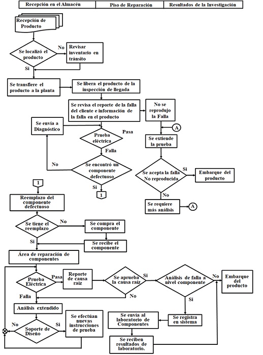 Mapeo del proceso: Se realizó un mapeo del proceso de reparación y análisis de falla de principio a fin, con sus pasos y operaciones para tener una clara identificación de cómo trabajan y cuáles son las que consumen mayor tiempo en el proceso, para poder enfocarnos en estas e identificar los problemas que las afectan. El mapeo del proceso se dividió en cuatro secciones críticas las cuales fueron las siguientes.