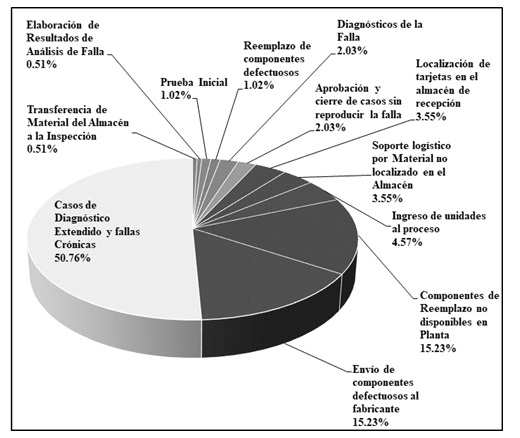 d. Resultados de la investigación/Causa raíz: Se relaciona con los resultados finales de la investigación o si la falla de la tarjeta no fue reproducida en la fábrica. Después de realizar el mapeo del proceso de análisis de fallas, se caracterizaron las operaciones involucradas en dicho flujo basándose en los datos históricos recabados en el sistema de colección de datos de la planta, obteniendo así el tiempo que ha sido utilizado en cada operación para realizar las actividades propias de la operación. Una vez obtenido el mapeo del proceso se puso en análisis con el equipo multifuncional discutiendo los tiempos obtenidos y se optó por concentrar los esfuerzos de mejora en la operación con mayor contribución al proceso de Análisis de Falla, siendo este detractor el relacionado con los Casos de diagnóstico extendido y fallas crónicas con una contribución del 50.76%.