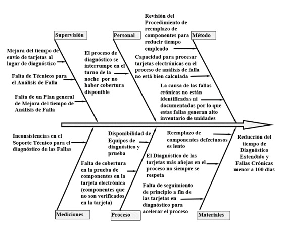 Diagrama causa-efecto (Ishikawa): En esta fase se realizó un análisis detallado del proceso y se construyó un diagrama causa-efecto (Ishikawa) mediante una lluvia de ideas del equipo de trabajo con la finalidad de identificar las variables que pudieran estar generando los casos de diagnóstico extendido y fallas crónicas (Figura 6