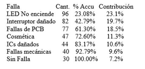 Resumen: Este artículo presenta la aplicación de la metodología de Seis Sigma para la investigación e identificación de los defectos que generaron fallas funcionales en tarjetas electrónicas para telecomunicaciones. Dichas tarjetas fueron retornadas a una planta de manufactura para el diagnóstico de la falla. Utilizando la metodología de Seis Sigma, análisis estadístico, diseño de experimentos y una microscopía de componente, -una técnica de laboratorio que analiza la morfología de materiales sólidos-, se identifican los principales detractores que generan la mayor cantidad de averías y retornos del cliente. Al obtener esta identificación la investigación se torna en la corrección del defecto y la disminución de la falla principal causada por fallas de LED que representa el 15.24% de defectivo y que genera un alto inventario de tarjetas retornadas a la fábrica, propiciando que el tiempo de ciclo empleado en las operaciones involucradas en el análisis de falla sea un promedio de 30 días. Debido a este problema la fábrica ha establecido un objetivo de 15 días de tiempo de ciclo, para que una tarjeta sea diagnosticada y reparada y un 0.5% de defectivo generado en la línea de producción para las fallas de LED.