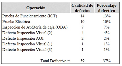De los datos colectados también se identifica que las operaciones con más rechazos son las pruebas eléctricas con el 13% en el ICT y 10% en la prueba eléctrica Funcional (Tabla 3).