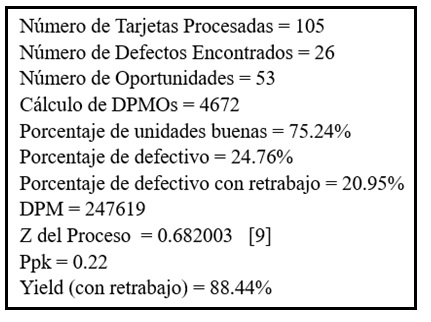 Otra de las medidas de eficiencia calculadas fueron los DPMO (Defects per Million Opportunities) que reflejan la cantidad de defectos que ocurren en un millón de oportunidades y que representa una medición de capacidad para datos discretos (atributos); este dato es importante porque nos permite comparar los resultados obtenidos con otras corridas (5).