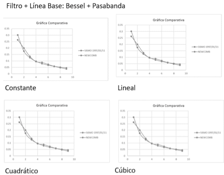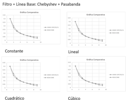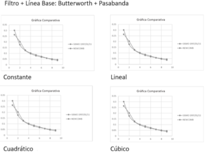 A las señales seleccionadas se les realizaron 12 combinaciones de correcciones de línea base (constante, lineal, cuadrática y cúbica) con tres opciones de filtro pasabanda (Butterworth, Chebyshev y Bessel). Para cada combinación se revisó nuevamente el cumplimiento de la ley NB y se distinguieron los registros que la cumplían de aquellos que no, destacando la combinación con la que la cumplieran mejor.