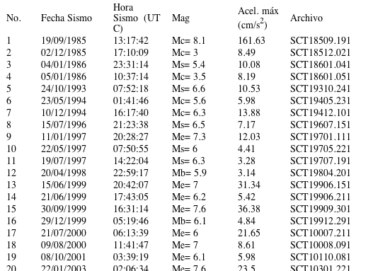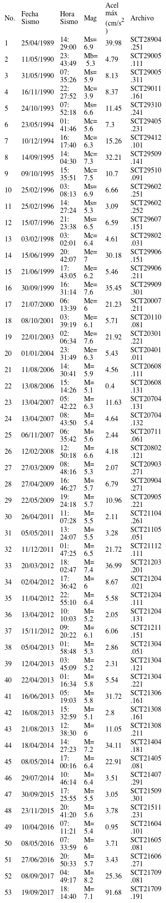 Se consultó la página de la Red Acelerográfica del Instituto de Ingeniería de la UNAM-Base de datos de registro [1], y como sitio icónico a partir de septiembre de 1985, se seleccionaron las estaciones SCT1 y SCT2, con todos los registros reportados hasta diciembre de 2017 (20 y 53 eventos, respectivamente).