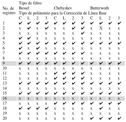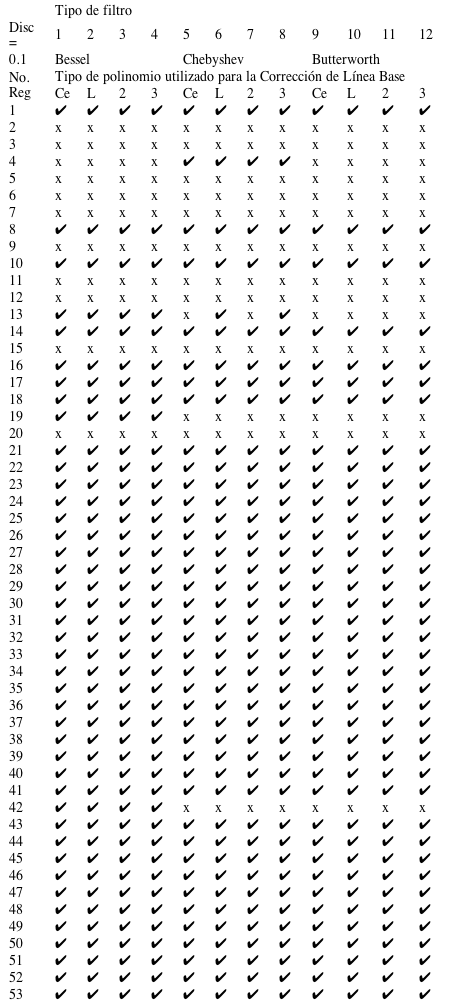 Un criterio menos subjetivo consiste en calcular un valor de “discrepancia” con respecto a los valores esperados de acuerdo con la Ley NB. Se calcula el porcentaje de discrepancia de cada dígito y la suma de todos éstos es lo que se presenta como valor. La tabla 4 presenta los registros que después de ser sometidos a los procesos de filtrado y corrección de línea base cumplieron con la Ley NB con una discrepancia menor o igual al 10 %. Se puede decir que cuánto más se relaja este valor un mayor número de registros cumplen con la Ley.