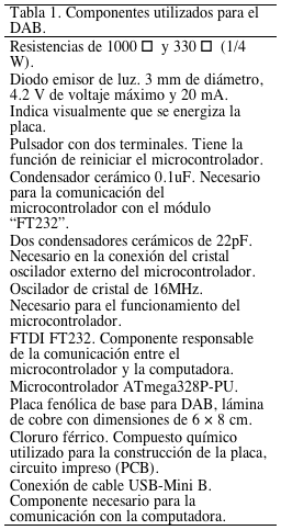 La característica principal de una placa de adquisición de datos (DAB) es utilizar el mínimo de componentes, que sea de bajo costo y que tenga una operación óptima para resolver las tareas necesarias del usuario. El microcontrolador ATmega328P fue utilizado para diseñar la DAB, su característica principal es su bajo costo y versatilidad. Para el diseño y construcción de la placa, se seleccionaron componentes de bajo costo y fáciles de obtener. Los componentes se muestran en la Tabla 1.