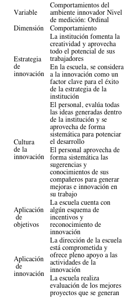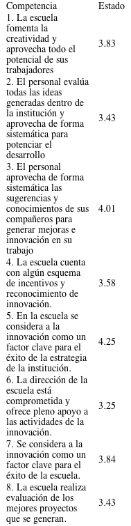 También, es muy importante reconocer la responsabilidad de la Dirección; la cual es gestionar un ambiente innovador, como parte fundamental de la administración de la educación al interior de la institución. Se realizó la adaptación del instrumento de Aparicio [1], para medir los comportamientos que dan validez a la innovación. Para identificar las fortalezas y áreas de oportunidad, y con ello sentar la base para la realización de un programa de desarrollo del talento humano para reforzar los comportamientos con menos presencia en la institución. Y encontrar cuales comportamientos tienen una relación significativa positiva, que nos ayude a reproducirlos para incrementar los comportamientos de innovación en la institución.