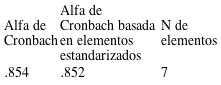 Análisis de confiabilidad. Alpha de Cronbach del instrumento aplicado para la confiabilidad de la variable estudiada (ver tabla 2). Según Cronbach (1993), este se usa para conocer la consistencia interna de una escala, es decir la correlación entre los ítems, y para establecer la homogeneidad [16]. Campo-Arias y Oviedo [16]; mencionan que este coeficiente oscila entre -1,0 y 1,0 y se considera que la consistencia interna es alta si se encuentra entre 0,70 y 0,90. Los valores inferiores a 0.70 indican una baja consistencia interna y los superiores a 0.90 sugieren que la escala tiene varios ítems que miden exactamente lo mismo o que está compuesta por más de veinte ítems [9]. No hubo reducciones de elementos y podemos aseverar que la consistencia interna de la escala es alta, esto por el valor obtenido (Tabla 2).
