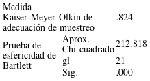 Contraste en el modelo factorial. Existen varios contrastes que pueden realizarse para evaluar si el modelo factorial (o la extracción de los factores) en su conjunto es significativo. El test KMO (Kaiser, Meyer y Olkin) relaciona los coeficientes de correlación, rjh, observados entre las variables Xj y Xh, y ajh son los coeficientes de correlación parcial entre las variables Xj y Xh. En la investigación, estos valores representan cada uno de los comportamientos (Xj), comparados con los demás (Xh). Cuanto más cerca de 1 tenga el valor obtenido del test KMO, implica que la relación entre las variables es alta. Si KMO ≥ 0.9, el test es muy bueno; notable para KMO ≥ 0.8; mediano para KMO ≥ 0.7; bajo para KMO ≥ 0.6; y muy bajo para KMO < 0.5. La prueba de esfericidad de Bartlett evalúa la aplicabilidad del análisis factorial de las variables estudiadas. El modelo es significativo (aceptamos la hipótesis nula, H0) cuando se puede aplicar el análisis factorial Prueba de esfericidad de Bartlett: Si Sig. (p-valor) < 0.05 aceptamos H0 (hipótesis nula) > se puede aplicar el análisis factorial. Si Sig. (p-valor) > 0.05 rechazamos H0 > no se puede aplicar el análisis factorial [9].