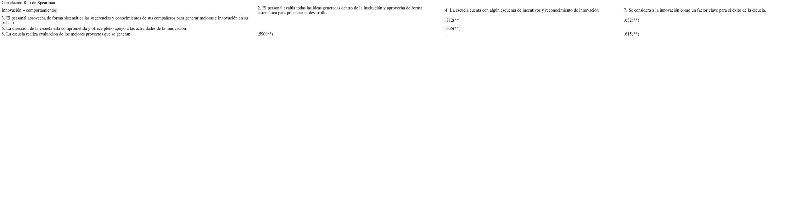 Los comportamientos con una correlación más significativos (0.712**) son: El personal aprovecha de forma sistemática las sugerencias y conocimientos de sus compañeros para generar mejoras e innovación en su trabajo con La escuela cuenta con algún esquema de incentivos y reconocimiento de innovación; entre otros.