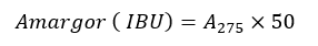 Determinación de amargor . Las sustancias amargas se extrajeron según el método EBC 9.8 o también conocido como IBU [10]. La cerveza fue desgasificada previamente, en un tubo de centrífuga se colocan 10 mL de cerveza sin filtrar, 1 mL de ácido clorhídrico (3N) y 20 mL de iso-octano, el tubo se agitó durante 5 minutos a temperatura ambiente a 250 rpm y luego se centrifugó durante 15 minutos a 4000 rpm. La fase transparente del iso-octano se decantó en un tubo de ensayo limpio y seco, el tubo de muestra se cubrió y se dejó reposar en la oscuridad durante 30 minutos, se mide la absorbancia a 275 nm (A275) en una celda de cuarzo con iso-octano puro como referencia. Los resultados son expresados como IBU, y su cálculo se obtiene con la ecuación (2):