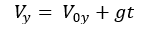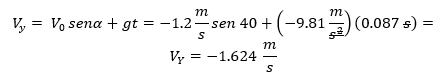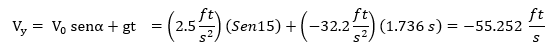 (17)Para determinar la velocidad final en Y (VY), se sustituye el tiempo (t), la velocidad inicial (V0) y la aceleración gravitacional (g) en la Ecuación (18):