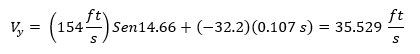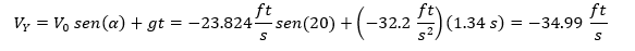Para determinar la velocidad final en Y (VY), se sustituye el tiempo (t), la velocidad inicial (V0)y la aceleración gravitacional en la Ecuación (23):