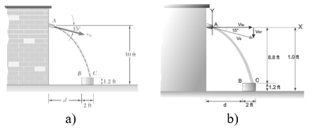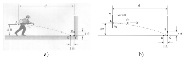 Ejercicio 11.101 de [10]: Un jugador de balonmano lanza una pelota desde A con velocidad horizontal V0. Si d = 15 ft, determine el valor con velocidad horizontal para la cual la pelota golpeara en la esquina C. Solución 34.7 ft / s. Ver figura 8.