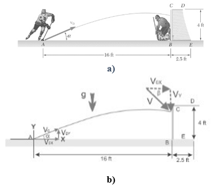 Ejercicio 11.112 de [10]: La velocidad inicial V0de un disco de hockey es de 105 mi / h. Determine a) el valor máximo (menor que 45°) del ángulo para el cual el disco entra en la portería, b) el tiempo correspondiente que se requiere para que el disco llegue a la portería, como se observa en la figura 11. Solución a) 14.66 ° , b) 0.1074 s.