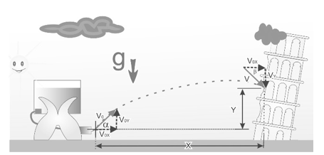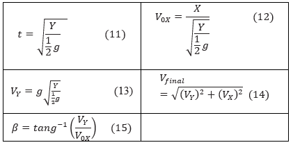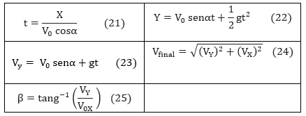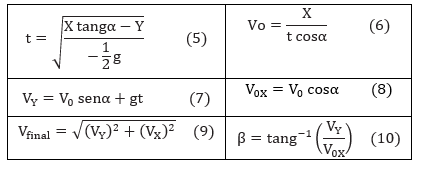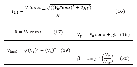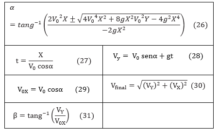 En este caso se parte del conocimiento de la velocidad inicial (V0) y la posición inicial y final en los ejes vertical (X , Y) como se muestra en la Figura 6. El fin fue determinar el ángulo (α) y (β), el tiempo (t) y la velocidad final (Vf).