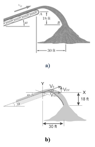Ejercicio 11.105 de [10]: Mediante una banda transportadora se descarga arena en A y cae en la parte superior de un montículo en B. Si se sabe que la banda transportadora forma un ángulo α = 20° con la horizontal, determine la velocidad V0de la banda, como se observa en la Figura 7. Solución 23.8 f t / s .