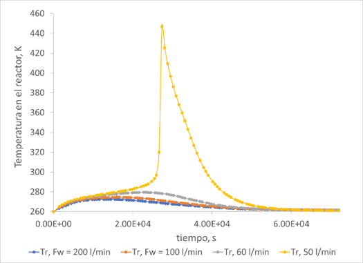 Para el primer escenario (incidente A), el modelo del reactor se resolvió usando Polymath, luego se genera la desviación en la variable Fw, flujo del refrigerante, lo cual ocasionó el descontrol térmico del reactor. Se analizaron también las desviaciones en las variables de Tcool,in, tdos, Vdos1 y Conc% en el modelo del reactor. En cualquiera de los casos analizados se obtuvo una cantidad similar de formación de ácidos carboxílicos. Por esta razón se consideró sólo analizar el efecto de la desviación en la variable Fw. El valor de 100 l/min para Fw, sirvió como base y a partir de este valor se hicieron los cambios que se observan en las Figuras 1 y 2, hasta obtener el descontrol térmico. Esto sucede para un valor de Fw de 50 l/min.
