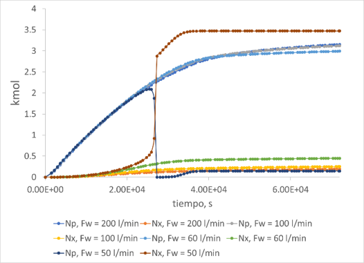 es la capacidad calorífica total del sistema (J/K); Tcool es la temperatura del fluido de enfriamiento en la chaqueta (K) con una temperatura de entrada Tcool,in de 260 K y Fw es el flujo de refrigerante en la chaqueta (100 l/min). Los valores en el tiempo inicial para las variables que se integraran a lo largo de un tiempo de 20 h son NP = 0, NX = 0, Tr = 260 K y Tcool = 273.15 K. El modelo del reactor se resolvió usando Polymath [10].