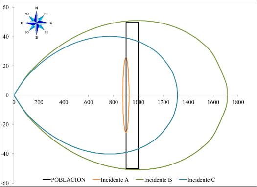 Para el segundo escenario (incidente B) se supuso una fuga continua de ácido fórmico de 6 kg/s. Esta situación genera una isopleta con un centro en los 992.8 m (en dirección Este) y 50.9 m de altura. En el tercer escenario posible (incidente C) se supone la fuga de ácido fórmico a través de un orificio de 1.5 cm, generando un flujo de 3.9 kg/s de ácido fórmico. Este incidente ocasiona una isopleta con centro a 768.7 m (en dirección Este) y altura de 40.2 m. En la Figura 3 se muestran las zonas de afectación de los tres incidentes superpuestas.
