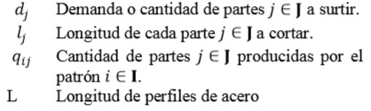 En el modelo matemático en el que se minimiza la cantidad de perfiles utilizados, se determinan dos conjuntos los cuales son: el conjunto de patrones a cortar y el conjunto de partes a satisfacer. Estos conjuntos serán identificados en el algoritmo con I y J, y los elementos que integrarán a estos conjuntos serán identificados con i y j, siendo J el conjunto de Partes, e I el conjunto de Patrones. Los parámetros se obtienen de un formato interno de la empresa: “Orden de fabricación". La información que se toma del formato es: Cantidades de partes a surtir, longitudes de partes a cortar, códigos de partes a fabricar, materia prima de la cual son cortadas las partes. En función de la identificación de partes se determinan los parámetros para desarrollar el modelo los cuales son descritos con la siguiente notación:
