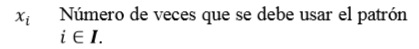 Se identifica como variable de decisión a 𝑥𝑖, la cual contesta la pregunta: ¿Cuántas veces se debe ejecutar el patrón de corte 𝑖 ∈ 𝐈? Por lo que la variable se define como:
