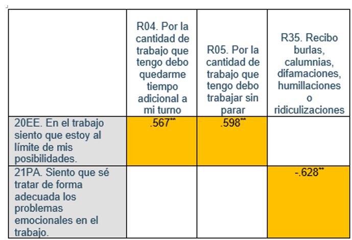 De estas, se puede aseverar que hay una relación significativa entre ambas variables. Se mencionan las tres más significativas. La relación más significativa es negativa, cuando el docente recibe burlas, calumnias, difamaciones, humillaciones o ridiculizaciones baja un 62.8% la capacidad de tratar de forma adecuada los problemas emocionales en el trabajo.
