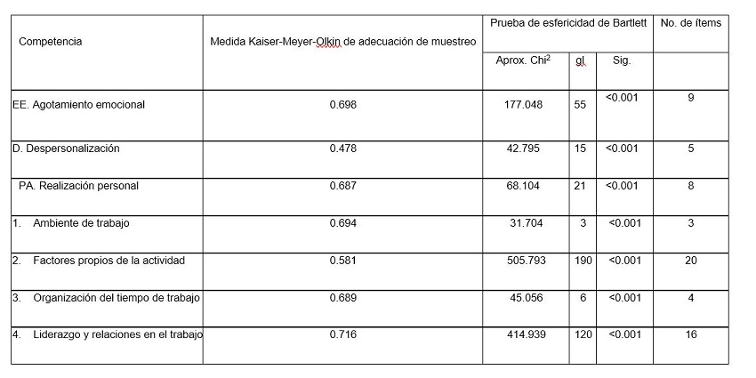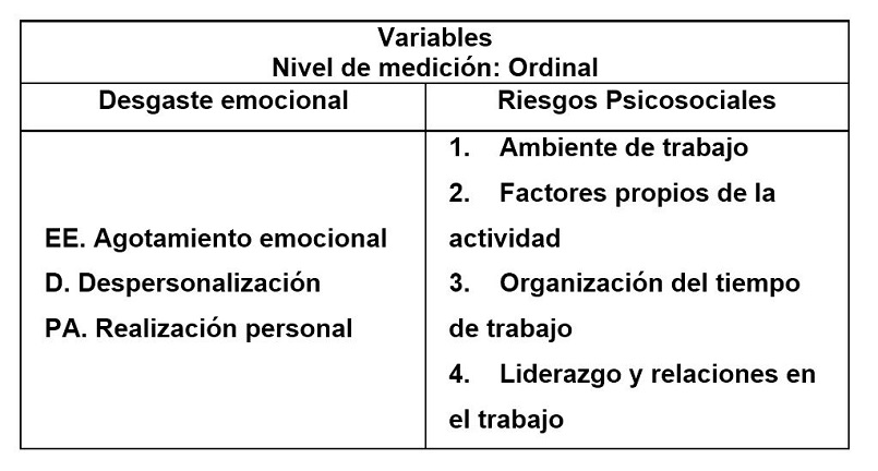 A questionnaire was used as a Likert-type scale measurement instrument, applying the content validity by expert judgment and construct validity with analysis of sample adequacy measure (KMO > 0.5) and Bartlett’s Test of Sphericity (p-value ≤ 0.05), in addition reliability was analyzed with consistency analysis (Cronbach’s alpha, α > 0.7) and analysis of the discrimination capacity of the items (homogeneity index ≥ 0.2). For Psychosocial Risks, a questionnaire based on the NOM-035-STPS -2018 Standard was applied, designed with 43 items, for the Psychosocial Risks variable, which measures 4 sub-variables: work environment (3 items), Factors specific to the activity (20 items), organization of work time (4 items) and Leadership and relationships at work (16 items). For Burnout Syndrome, a questionnaire based on Maslach, C. and Jackson, S.E. (1986) and Seisdedos, (1997) was applied, designed with 22 items, for the Burnout Syndrome variable, measuring 3 sub-variables: emotional exhaustion (9 items), depersonalization (5 items) and personal fulfillment (8 items).