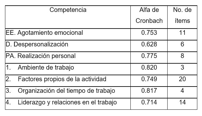 c) Fiabilidad - Análisis de consistencia (Alpha de Cronbach). Según Cronbach (1993, en [ 24]), este se usa para conocer la consistencia interna de una escala, es decir la correlación entre los ítems, y para establecer la homogeneidad. Campo-Arias y Oviedo [ 24]; afirman que la consistencia interna es alta si es mayor a 0,70 [ 23]. La variable desgaste emocional no tuvo reducciones, para la variable Riesgos Psicosociales, para subir el nivel de Alpha se eliminaron dos comportamientos: R38: Se ignoran mis éxitos laborales y se atribuyen a otros trabajadores; y R39: Me bloquean o impiden las oportunidades que tengo para obtener ascenso o mejora en mi trabajo. Para obtener un valor de α = 0.583 a α = 0.714