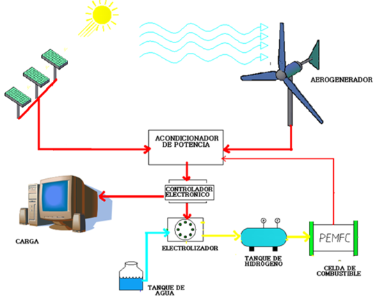 Las fuentes primarias de energía son el sol y el viento que se transforman en electricidad mediante el arreglo fotovoltaico y el aerogenerador. La energía eléctrica generada se suministra de manera directa a una carga (es decir a alimentar algún equipo eléctrico). Cuando existe un superávit de producción eléctrica del sistema híbrido con respecto a la carga, debido a las condiciones de velocidad del viento y de la radiación solar, el exceso de energía eléctrica es empleada para producir hidrógeno mediante electrólisis del agua (hidrógeno verde), y almacenarlo. En un siguiente paso, el hidrógeno es aprovechado en una celda de combustible MPIP, esto permite generar electricidad y emplearla en aplicaciones móviles o cuando no se cuente con las otras fuentes de producción disponibles (oscuridad, poca radiación solar o velocidad del viento baja).