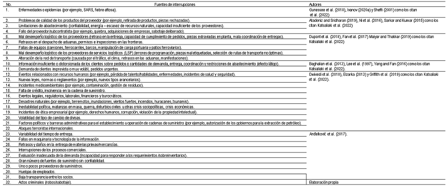Diversas denominaciones y clasificaciones han surgido respecto a las fuentes de interrupción de la cadena de suministro. La incertidumbre y el riesgo tienen una cercanía conceptual. Igual que Christopher y Peck [1], Um & Han [2] denominaron factores de riesgo a los eventos que interrumpen la cadena de suministro, Pettit [3] los llamó vulnerabilidades, Simangunsong et al. [4] fuentes de incertidumbre y Katsaliaki et al. [5] razones de disrupciones.