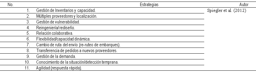 Las estrategias utilizadas para enfrentar las interrupciones y generar resiliencia en la cadena de suministro pueden tener dos enfoques: uno de contingencia y otro de mitigación [8]. La principal diferencia es que las estratégicas de contingencia se toman antes del evento disruptor y pueden ser: gestión de Inventarios y capacidad; múltiples proveedores y localización; gestión de vulnerabilidad; reingeniería/ rediseño; relación colaborativa y flexibilidad/capacidad dinámica. Por otra parte, las estrategias de mitigación se toman después del evento disruptor y pueden ser: cambio de ruta del envió (re-ruteo de embarques); transferencia de pedidos a nuevos proveedores; gestión de la demanda; conocimiento de la situación/detección temprana y agilidad (respuesta rápida). Contrariamente al proceso seguido por Pires y Barbosa-Pova [9] antes de analizar los avances en el desarrollo de modelos cuantitativos de resiliencia de la cadena de suministro, se prefirió analizar las estrategias que se han utilizado en el contexto local, partiendo de las 11 que identificaron Spiegler et al. [8], las cuales se describen enseguida.
