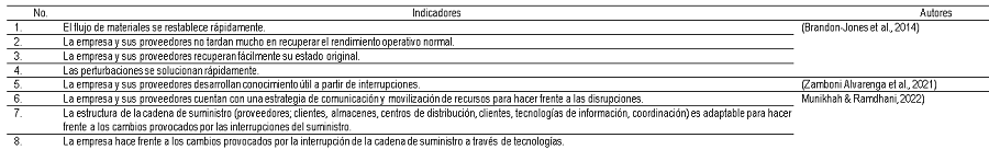 Los indicadores utilizados para medir la resiliencia de la cadena de suministro proceden de tres fuentes [19], [20] y [21] que se muestran en la Tabla 3.