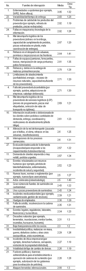 En diversas fuentes de interrupción de la cadena de suministro las empresas que mayor impacto tienen en el desempeño operativo de las empresas, tanto estas como la cadena de suministro en su conjunto, tienen una limitada capacidad para evitar eventos disruptivos como en los casos de epidemias, retrasos en el despacho de aduanas, permisos e inspecciones en las fronteras, fallas de equipos (camiones, ferrocarriles, barcos, manipulación de carga portuaria y patios ferroviarios, limitaciones de abastecimiento (confiabilidad, energía – escasez de recursos naturales, capacidad insuficiente de los proveedores), por mencionar algunas ubicadas entre las 10 primeras calificadas por los respondientes. Por ello, la identificación y categorización de las fuentes de interrupción que mayor impacto tienen en el desempeño operativo de las empresas y las cadenas de suministro es un paso importante para su prevención atención.
