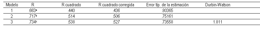 Los datos de la robustez estadística del modelo de regresión se presentan en la Tabla 8. El tamaño del efecto del tercer modelo fue calculado mediante la aplicación Gpower en la que se propone que se consideren grandes a los valores mayores de 0.35, por lo que puede decirse que la magnitud de la relación entre las variables predictoras y la variable de resultado, que es lo que mide el tamaño del efecto, es grande. La potencia estadística fue de 1 por lo que se considera adecuada dado que supera el valor de .20 indicando así la probabilidad de rechazar correctamente una falsa hipótesis nula.