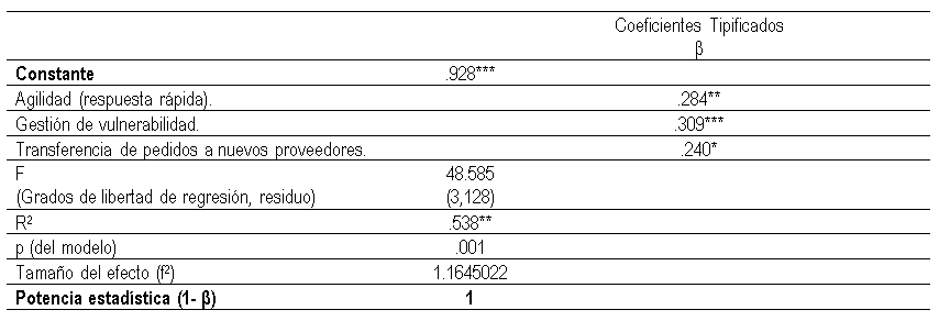 Para someter a prueba la hipótesis y lograr el objetivo de evaluar el impacto que tienen las estrategias utilizadas por las empresas estudiadas sobre la resiliencia de sus cadenas de suministro, se utilizó la técnica de regresión lineal múltiple con el método por pasos considerando a la resiliencia como variable dependiente y a las estrategias utilizadas como variables independientes (Tabla 7).