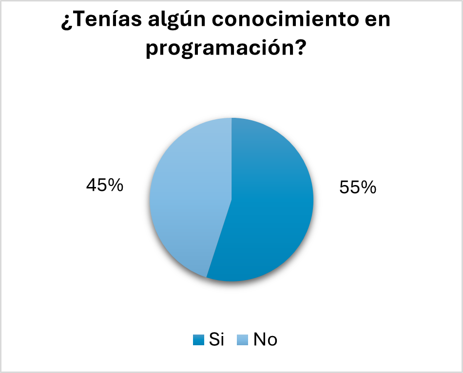 Posterior a eso, la siguiente pregunta fue sobre su conocimiento en programación, aunque la gráfica de la Figura 9, se visualiza casi equitativamente, hay un mayor porcentaje de adolescentes que tienen conocimiento en programación.