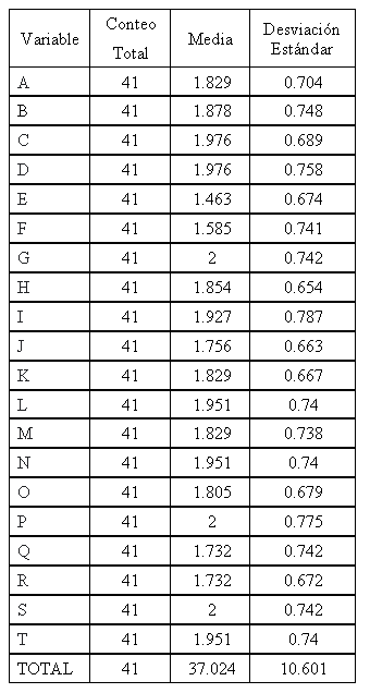En la tabla 2, se identifica la Media y la Desviación Estándar de cada una de las preguntas aplicadas en el cuestionario; Se detecta que se presenta muy poca dispersión y variación tanto en la media para los reactivos, como en la media y datos de observación.